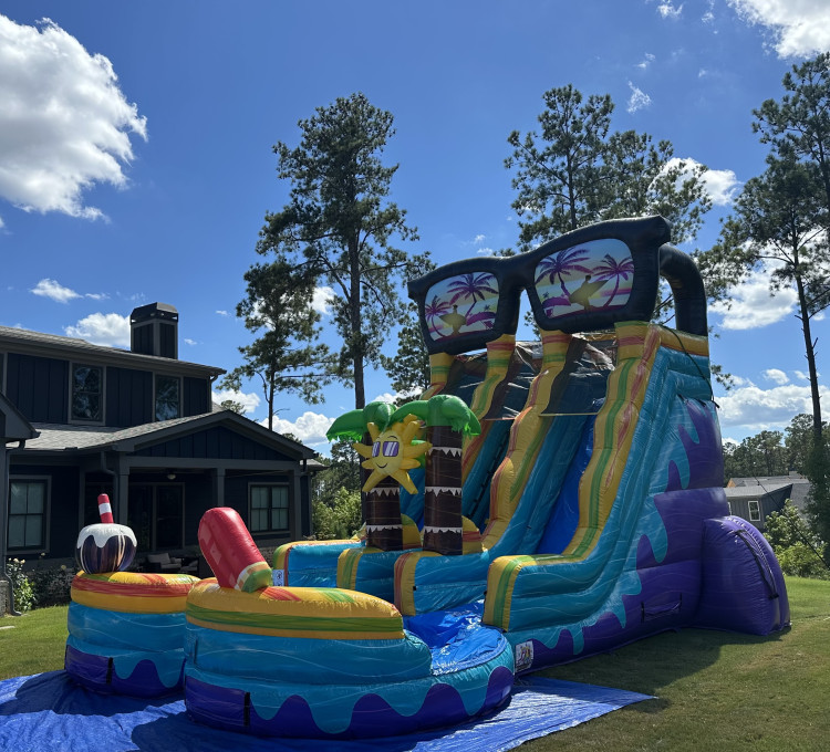 Get ready for double the fun with this Tropical Island Breeze Dual Lane Waterslide! This vibrant, eye-catching inflatable brings island vibes right to your backyard with it's lush palm trees, bright colors, and tropical design. Featuring two exciting lanes, kids and adults can race side-by-side down the slide before splashing into the pools at the bottom. Perfect for summer parties, birthdays, or any outdoor event. This waterslide keeps the energy high and fun non-stop. With it's tall center climb, fast slides, and tropical theme, it's the ultimate backyard escape!