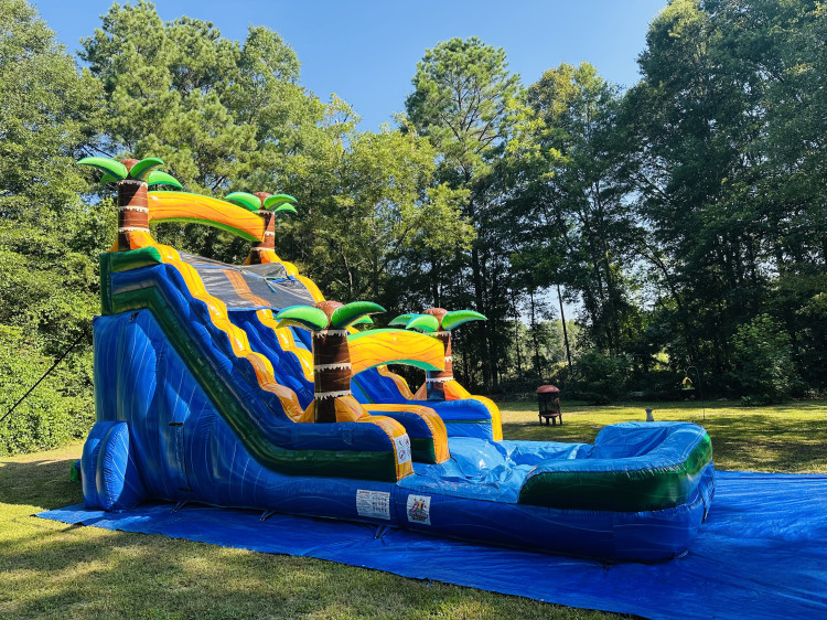 Make a splash with the Tropical 20 Ft Tall Waterslide — the ultimate summer thrill ride! Towering at an exciting 20 feet high, this vibrant inflatable is a tropical paradise packed with non-stop fun. Climb to the top beneath swaying inflatable palm trees, take in the view, then zoom down the super-slick slide into a refreshing splash zone below. With its bold island colors and beachy vibes, this slide brings the vacation to your backyard! Perfect for birthdays, cookouts, and hot summer days — it’s a tropical adventure everyone will love!