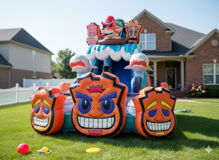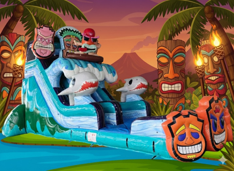 The 20' Tiki Tovi Water Slide is a great way to bring a tropical twist to your party! Its unique design is sure to draw everyone's attention! Ride the wave with Tovi all the way to the splash pool at the bottom.